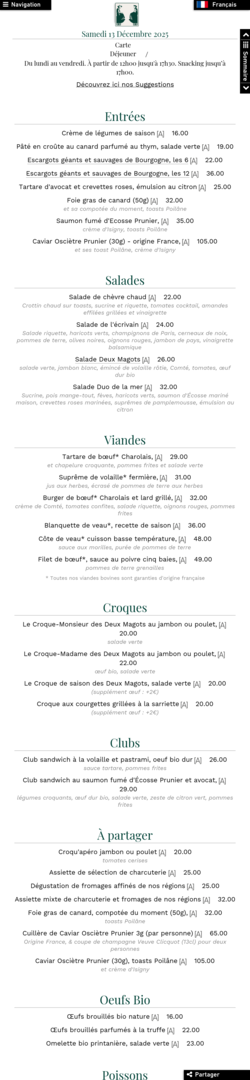 Votre message Carte Déjeuner - Les Deux Magots https://menuonline.fr/deux-magots/carte-dejeuner LangueFrançaisEnglishEspañolPусский中文日本人Português Signature Destinataire